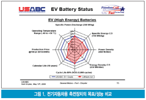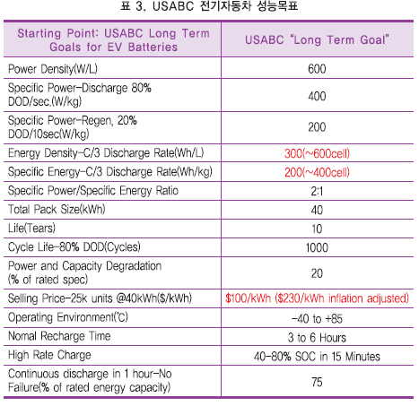 표 3과 그림 1은 미국 USABC의 전기자동차용 축전장치의 성능목표와 현재의 목표/성능을 비교하고 있다.