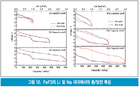 불화철(FeF3)은 LiFeF3의 리튬이온 삽입/탈리 반응인 Li++e-+FeF3 → LiFeF3에 의한 이론적 용량이 237mAh/g이지만 역반응 3Li++3e-+FeF3 → Fe+3LiF에서는 이론용량 711mAh/g, 에너지 밀도가 1400Wh/kg로서 대폭적인 용량 증대를 기대할 수 있다. 3전자 반응까지는 실용화가 어려울 것이나 2전자 반응까지는 리튬이온 삽입/탈리 반응을 실용화시킬 가능성이 보인다. 불화철 가격 등의 재료비는 약 1,700엔/kg으로 NEDO의 목표비용인 5,000엔/kg을 크게 밑돈다. 그림 10은 FeF3의 Li 및 Na 대극에서의 충/방전 특성을 보여준다.