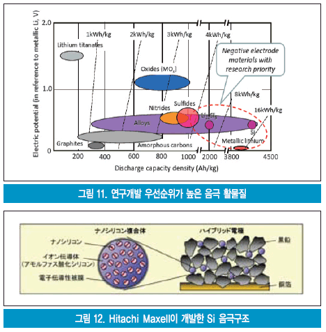 그림 11은 NEDO가 밝힌 음극재료 개발방향을 도식화 한 것이다. 흑연계 등은 전해액과의 반응성 억제, 합금과의 복합화기술에 의한 에너지밀도 향상 등이 개발방향이다. 2,500Wh/kg의 에너지밀도를 실현시킬 수 있는 SiO계, SnO계, 산화물계 재료의 실용화는 초기 불가역 용량의 저감과 신뢰성 향상 및 전해액과의 반응성 억제가 개발방향이다. 4,000Wh/kg의 에너지밀도를 실현할 수 있는 Si계, Sn계 등의 합금계 재료는 추가적인 장수명화와 신뢰성 및 열적 안전성 향상이 개발과제이다.
