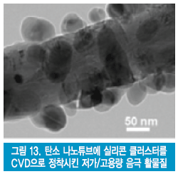 Panasonic은 실리콘 음극을 사용하여 용량을 30% 향상시킨 18650형 원통형 4Ah 리튬이온 이차전지의 양산을 2012년에 개시하여 휴대형 전자기기뿐만 아니라 가정용, 자동차용으로도 판매할 계획이다. P. Kumta는 석영기판 위에 탄소 나노튜브를 화학기상도금법(CVD: Chemical Vapor Deposition)으로 성장시킨 뒤에 CNT 위에 다시 CVD법으로 실리콘 나노 클러스터를 형성시켰는데, 그림 13는 음극 활성물질의 투과전자현미경 사진이다.