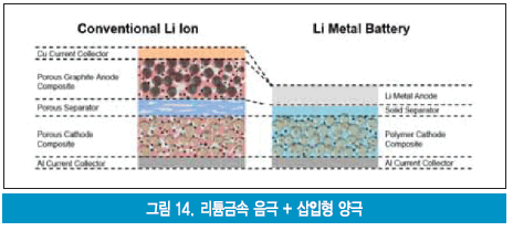 이론적 에너지밀도에서 가장 큰 값을 보이는 리튬금속(15,000Wh/kg, 8,000Wh/L)을 음극으로 사용하기 위해 덴드라이트 생성 억제, 장수명, 신뢰성 향상을 목적으로 한 기초적인 연구가 진행 중에 있다. 이들 기술 개발과제를 동시에 해결할 것으로 기대되고 있는 기술 중 하나가 전해질로 고체전해질을 사용하는 전고체 리튬이온 이차전지이다. 그림 14는 종래의 리튬이온 이차전지와 리튬금속/고체전해질을 사용하였을 경우의 에너지밀도 변화를 도식적으로 표시한 것이며, 성능이 크게 향상됨을 알 수 있다.
