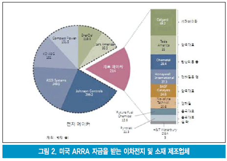 미국은 정부와 민간이 힘을 합쳐 생산체제 구축을 가속시키고 있다. 리튬이온 이차전지의 생산거점은 일본과 한국 그리고 중국 등 아시아지역에 집중되어 있어 미국에는 국제경쟁력 있는 리튬이온 이차전지 제조업체가 없었다. 미국 오바마 정부는 환경친화형 자동차의 핵심기술인 축전장치 등 관련 요소기술의 생산시설을 미국에 구축하여 자동차 산업의 국제경쟁력을 향상시키고 고용을 창출하는 등 경기 자극책으로 ARRA법을 활용한 대규모 지원계획을 발표하였다. 이 사업에 선정되어 미국 내에 생산시설을 구축하는 기업을 그림 2와 같다.