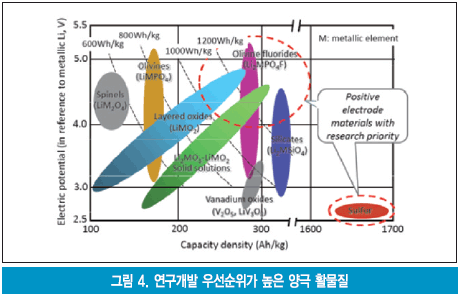 그림 4는 NEDO의 리튬이온 이차전지 양극재료 개발의 우선순위를 나타낸 기술 로드맵이다.