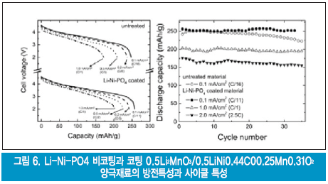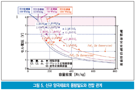 최근의 새로운 움직임으로서 Li2MO3(M: Ni, Co, Mn, Fe 등 천이금속)으로 조성을 나타내는 재료연구가 활발하다. 이들 재료는 방전용량이 250mAh/g로 매우 큰 것 등의 빼어난 성능을 보이는 것들이 보고되고 있다. 그림 5는 새로운 양극재료의 용량밀도와 전압과의 관계를 상세하게 나타내고 있다.
