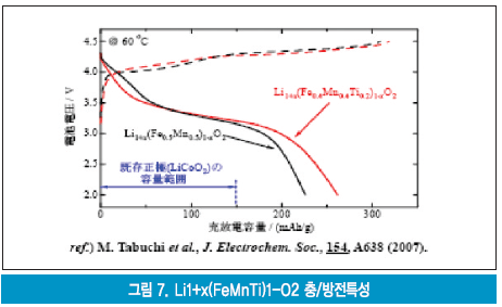 최근에는 리튬을 2개 갖는 재료 Li2MO3(M은 한 종류 또는 복수 종류의 천이금속 이온)의 조성으로 표현할 수 있는 재료연구가 수행되고 있다. C.S. Johnson 등은 이들의 방전용량이 250mAh/g로서 매우 크고 우수한 성능을 나타내는 것으로 보고 하고 있다. Li1-x(Fe0.4Mn0.4C00.2)1-xO2에서 초기 방전용량 226mAh/g을 개발하여 가능성 있는 새로운 양극재료를 찾아냈다. 이들은 고용량이며 가격 저감 가능성을 지녔으나 사이클 수명과 저온에서의 용량 저하 과제를 극복해야 한다. M Tabuchi 그룹은 Co를 Ti로 치환하여 그림 7과 같은 262mAh/g의 고용량의 양극재료를 개발하였다.