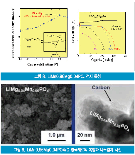 그림 8은 초기 충/방전효율과 cut-off voltage 및 충/방전특성이다. 그림 9는 LiMg0.04Mn0.96PO4/C 나노 컴복합화 입자상이다.