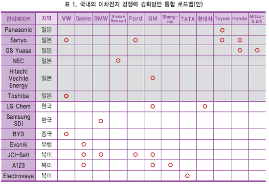 일본 정부는 전기자동차 분야에서 일본의 우위성과 한국 등 외국의 추격사례를 분석하고 이에 대한 국가적인 개발정책을 수립하고 있다. 표 2는 전지 제조업체와 완성차 제조업체와의 제휴관계를 정리한 것이다. 유럽과 미국의 완성차 제조업체들은 복수의 전지 제조업체와 제휴관계를 맺고 있음을 알 수 있다.