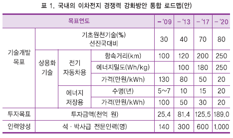 지식경제부, 기획재정부, 교육과학기술부 및 녹색성장위원회는 제8차 녹색성장위원회 보고회(2010.7)에서 “이차전지경쟁력 강화방안”을 보고한 바 있다. 세계적 경쟁력을 갖춘 소형전지는 시장에 맡기되 정부는 중대형 전지제조 및 소재 산업에 지원 역량을 집중하기 위해 표 1과 같은 통합로드맵(안)을 제시했다.